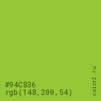 Цвет #94C836 в цветовой модели RGB обозначается тремя октетами (148, 200, 54) в десятичном формате и #94C836 в шестнадцатиричном (hex) формате, которые являются интенсивностью красного 148 (hex 94), интенсивность зелёного 200 (hex C8) и интенсивность синего 54 (hex 36).