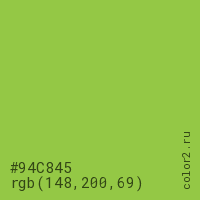 Цвет #94C845 в цветовой модели RGB обозначается тремя октетами (148, 200, 69) в десятичном формате и #94C845 в шестнадцатиричном (hex) формате, которые являются интенсивностью красного 148 (hex 94), интенсивность зелёного 200 (hex C8) и интенсивность синего 69 (hex 45).