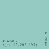 Цвет #94CAC2 в цветовой модели RGB обозначается тремя октетами (148, 202, 194) в десятичном формате и #94CAC2 в шестнадцатиричном (hex) формате, которые являются интенсивностью красного 148 (hex 94), интенсивность зелёного 202 (hex CA) и интенсивность синего 194 (hex C2).