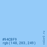 Цвет #94CBF9 в цветовой модели RGB обозначается тремя октетами (148, 203, 249) в десятичном формате и #94CBF9 в шестнадцатиричном (hex) формате, которые являются интенсивностью красного 148 (hex 94), интенсивность зелёного 203 (hex CB) и интенсивность синего 249 (hex F9).