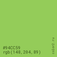 Цвет #94CC59 в цветовой модели RGB обозначается тремя октетами (148, 204, 89) в десятичном формате и #94CC59 в шестнадцатиричном (hex) формате, которые являются интенсивностью красного 148 (hex 94), интенсивность зелёного 204 (hex CC) и интенсивность синего 89 (hex 59).