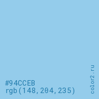 Цвет #94CCEB в цветовой модели RGB обозначается тремя октетами (148, 204, 235) в десятичном формате и #94CCEB в шестнадцатиричном (hex) формате, которые являются интенсивностью красного 148 (hex 94), интенсивность зелёного 204 (hex CC) и интенсивность синего 235 (hex EB).