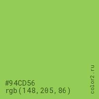 Цвет #94CD56 в цветовой модели RGB обозначается тремя октетами (148, 205, 86) в десятичном формате и #94CD56 в шестнадцатиричном (hex) формате, которые являются интенсивностью красного 148 (hex 94), интенсивность зелёного 205 (hex CD) и интенсивность синего 86 (hex 56).