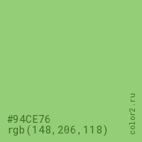 Цвет #94CE76 в цветовой модели RGB обозначается тремя октетами (148, 206, 118) в десятичном формате и #94CE76 в шестнадцатиричном (hex) формате, которые являются интенсивностью красного 148 (hex 94), интенсивность зелёного 206 (hex CE) и интенсивность синего 118 (hex 76).
