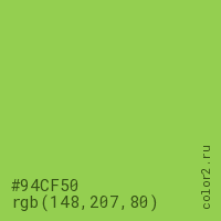 Цвет #94CF50 в цветовой модели RGB обозначается тремя октетами (148, 207, 80) в десятичном формате и #94CF50 в шестнадцатиричном (hex) формате, которые являются интенсивностью красного 148 (hex 94), интенсивность зелёного 207 (hex CF) и интенсивность синего 80 (hex 50).