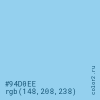Цвет #94D0EE в цветовой модели RGB обозначается тремя октетами (148, 208, 238) в десятичном формате и #94D0EE в шестнадцатиричном (hex) формате, которые являются интенсивностью красного 148 (hex 94), интенсивность зелёного 208 (hex D0) и интенсивность синего 238 (hex EE).
