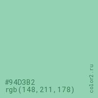 Цвет #94D3B2 в цветовой модели RGB обозначается тремя октетами (148, 211, 178) в десятичном формате и #94D3B2 в шестнадцатиричном (hex) формате, которые являются интенсивностью красного 148 (hex 94), интенсивность зелёного 211 (hex D3) и интенсивность синего 178 (hex B2).
