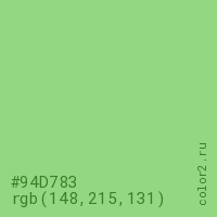 Цвет #94D783 в цветовой модели RGB обозначается тремя октетами (148, 215, 131) в десятичном формате и #94D783 в шестнадцатиричном (hex) формате, которые являются интенсивностью красного 148 (hex 94), интенсивность зелёного 215 (hex D7) и интенсивность синего 131 (hex 83).