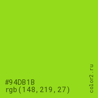 Цвет #94DB1B в цветовой модели RGB обозначается тремя октетами (148, 219, 27) в десятичном формате и #94DB1B в шестнадцатиричном (hex) формате, которые являются интенсивностью красного 148 (hex 94), интенсивность зелёного 219 (hex DB) и интенсивность синего 27 (hex 1B).