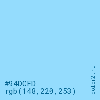 Цвет #94DCFD в цветовой модели RGB обозначается тремя октетами (148, 220, 253) в десятичном формате и #94DCFD в шестнадцатиричном (hex) формате, которые являются интенсивностью красного 148 (hex 94), интенсивность зелёного 220 (hex DC) и интенсивность синего 253 (hex FD).