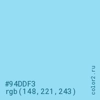Цвет #94DDF3 в цветовой модели RGB обозначается тремя октетами (148, 221, 243) в десятичном формате и #94DDF3 в шестнадцатиричном (hex) формате, которые являются интенсивностью красного 148 (hex 94), интенсивность зелёного 221 (hex DD) и интенсивность синего 243 (hex F3).