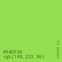 Цвет #94DF50 в цветовой модели RGB обозначается тремя октетами (148, 223, 80) в десятичном формате и #94DF50 в шестнадцатиричном (hex) формате, которые являются интенсивностью красного 148 (hex 94), интенсивность зелёного 223 (hex DF) и интенсивность синего 80 (hex 50).