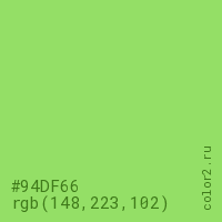 Цвет #94DF66 в цветовой модели RGB обозначается тремя октетами (148, 223, 102) в десятичном формате и #94DF66 в шестнадцатиричном (hex) формате, которые являются интенсивностью красного 148 (hex 94), интенсивность зелёного 223 (hex DF) и интенсивность синего 102 (hex 66).