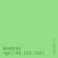 Цвет #94DF85 в цветовой модели RGB обозначается тремя октетами (148, 223, 133) в десятичном формате и #94DF85 в шестнадцатиричном (hex) формате, которые являются интенсивностью красного 148 (hex 94), интенсивность зелёного 223 (hex DF) и интенсивность синего 133 (hex 85).