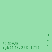 Цвет #94DFAB в цветовой модели RGB обозначается тремя октетами (148, 223, 171) в десятичном формате и #94DFAB в шестнадцатиричном (hex) формате, которые являются интенсивностью красного 148 (hex 94), интенсивность зелёного 223 (hex DF) и интенсивность синего 171 (hex AB).