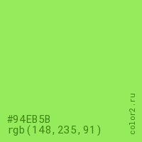 Цвет #94EB5B в цветовой модели RGB обозначается тремя октетами (148, 235, 91) в десятичном формате и #94EB5B в шестнадцатиричном (hex) формате, которые являются интенсивностью красного 148 (hex 94), интенсивность зелёного 235 (hex EB) и интенсивность синего 91 (hex 5B).