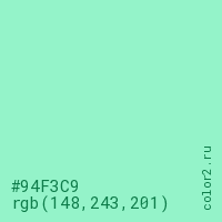 Цвет #94F3C9 в цветовой модели RGB обозначается тремя октетами (148, 243, 201) в десятичном формате и #94F3C9 в шестнадцатиричном (hex) формате, которые являются интенсивностью красного 148 (hex 94), интенсивность зелёного 243 (hex F3) и интенсивность синего 201 (hex C9).