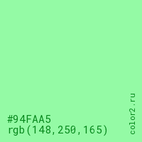 Цвет #94FAA5 в цветовой модели RGB обозначается тремя октетами (148, 250, 165) в десятичном формате и #94FAA5 в шестнадцатиричном (hex) формате, которые являются интенсивностью красного 148 (hex 94), интенсивность зелёного 250 (hex FA) и интенсивность синего 165 (hex A5).