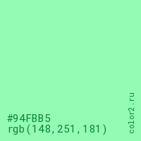 Цвет #94FBB5 в цветовой модели RGB обозначается тремя октетами (148, 251, 181) в десятичном формате и #94FBB5 в шестнадцатиричном (hex) формате, которые являются интенсивностью красного 148 (hex 94), интенсивность зелёного 251 (hex FB) и интенсивность синего 181 (hex B5).