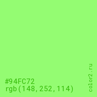 Цвет #94FC72 в цветовой модели RGB обозначается тремя октетами (148, 252, 114) в десятичном формате и #94FC72 в шестнадцатиричном (hex) формате, которые являются интенсивностью красного 148 (hex 94), интенсивность зелёного 252 (hex FC) и интенсивность синего 114 (hex 72).