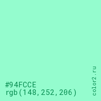 Цвет #94FCCE в цветовой модели RGB обозначается тремя октетами (148, 252, 206) в десятичном формате и #94FCCE в шестнадцатиричном (hex) формате, которые являются интенсивностью красного 148 (hex 94), интенсивность зелёного 252 (hex FC) и интенсивность синего 206 (hex CE).