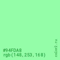 Цвет #94FDA8 в цветовой модели RGB обозначается тремя октетами (148, 253, 168) в десятичном формате и #94FDA8 в шестнадцатиричном (hex) формате, которые являются интенсивностью красного 148 (hex 94), интенсивность зелёного 253 (hex FD) и интенсивность синего 168 (hex A8).