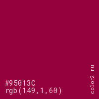 Цвет #95013C в цветовой модели RGB обозначается тремя октетами (149, 1, 60) в десятичном формате и #95013C в шестнадцатиричном (hex) формате, которые являются интенсивностью красного 149 (hex 95), интенсивность зелёного 1 (hex 01) и интенсивность синего 60 (hex 3C).