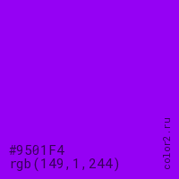 Цвет #9501F4 в цветовой модели RGB обозначается тремя октетами (149, 1, 244) в десятичном формате и #9501F4 в шестнадцатиричном (hex) формате, которые являются интенсивностью красного 149 (hex 95), интенсивность зелёного 1 (hex 01) и интенсивность синего 244 (hex F4).