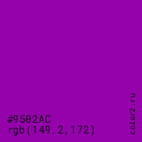 Цвет #9502AC в цветовой модели RGB обозначается тремя октетами (149, 2, 172) в десятичном формате и #9502AC в шестнадцатиричном (hex) формате, которые являются интенсивностью красного 149 (hex 95), интенсивность зелёного 2 (hex 02) и интенсивность синего 172 (hex AC).