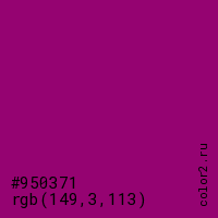Цвет #950371 в цветовой модели RGB обозначается тремя октетами (149, 3, 113) в десятичном формате и #950371 в шестнадцатиричном (hex) формате, которые являются интенсивностью красного 149 (hex 95), интенсивность зелёного 3 (hex 03) и интенсивность синего 113 (hex 71).