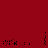 Цвет #950415 в цветовой модели RGB обозначается тремя октетами (149, 4, 21) в десятичном формате и #950415 в шестнадцатиричном (hex) формате, которые являются интенсивностью красного 149 (hex 95), интенсивность зелёного 4 (hex 04) и интенсивность синего 21 (hex 15).