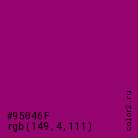 Цвет #95046F в цветовой модели RGB обозначается тремя октетами (149, 4, 111) в десятичном формате и #95046F в шестнадцатиричном (hex) формате, которые являются интенсивностью красного 149 (hex 95), интенсивность зелёного 4 (hex 04) и интенсивность синего 111 (hex 6F).