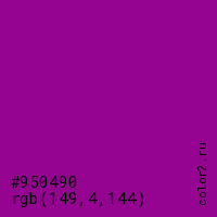 Цвет #950490 в цветовой модели RGB обозначается тремя октетами (149, 4, 144) в десятичном формате и #950490 в шестнадцатиричном (hex) формате, которые являются интенсивностью красного 149 (hex 95), интенсивность зелёного 4 (hex 04) и интенсивность синего 144 (hex 90).
