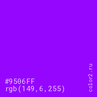 Цвет #9506FF в цветовой модели RGB обозначается тремя октетами (149, 6, 255) в десятичном формате и #9506FF в шестнадцатиричном (hex) формате, которые являются интенсивностью красного 149 (hex 95), интенсивность зелёного 6 (hex 06) и интенсивность синего 255 (hex FF).