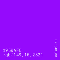 Цвет #950AFC в цветовой модели RGB обозначается тремя октетами (149, 10, 252) в десятичном формате и #950AFC в шестнадцатиричном (hex) формате, которые являются интенсивностью красного 149 (hex 95), интенсивность зелёного 10 (hex 0A) и интенсивность синего 252 (hex FC).