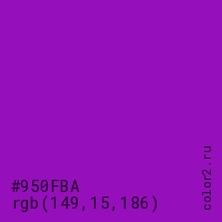 Цвет #950FBA в цветовой модели RGB обозначается тремя октетами (149, 15, 186) в десятичном формате и #950FBA в шестнадцатиричном (hex) формате, которые являются интенсивностью красного 149 (hex 95), интенсивность зелёного 15 (hex 0F) и интенсивность синего 186 (hex BA).