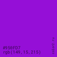 Цвет #950FD7 в цветовой модели RGB обозначается тремя октетами (149, 15, 215) в десятичном формате и #950FD7 в шестнадцатиричном (hex) формате, которые являются интенсивностью красного 149 (hex 95), интенсивность зелёного 15 (hex 0F) и интенсивность синего 215 (hex D7).
