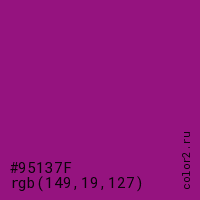 Цвет #95137F в цветовой модели RGB обозначается тремя октетами (149, 19, 127) в десятичном формате и #95137F в шестнадцатиричном (hex) формате, которые являются интенсивностью красного 149 (hex 95), интенсивность зелёного 19 (hex 13) и интенсивность синего 127 (hex 7F).