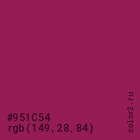 Цвет #951C54 в цветовой модели RGB обозначается тремя октетами (149, 28, 84) в десятичном формате и #951C54 в шестнадцатиричном (hex) формате, которые являются интенсивностью красного 149 (hex 95), интенсивность зелёного 28 (hex 1C) и интенсивность синего 84 (hex 54).