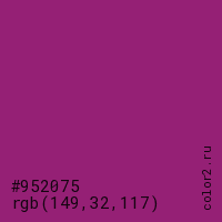 Цвет #952075 в цветовой модели RGB обозначается тремя октетами (149, 32, 117) в десятичном формате и #952075 в шестнадцатиричном (hex) формате, которые являются интенсивностью красного 149 (hex 95), интенсивность зелёного 32 (hex 20) и интенсивность синего 117 (hex 75).