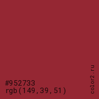Цвет #952733 в цветовой модели RGB обозначается тремя октетами (149, 39, 51) в десятичном формате и #952733 в шестнадцатиричном (hex) формате, которые являются интенсивностью красного 149 (hex 95), интенсивность зелёного 39 (hex 27) и интенсивность синего 51 (hex 33).