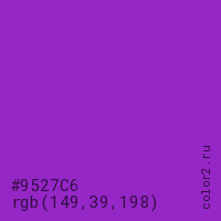 Цвет #9527C6 в цветовой модели RGB обозначается тремя октетами (149, 39, 198) в десятичном формате и #9527C6 в шестнадцатиричном (hex) формате, которые являются интенсивностью красного 149 (hex 95), интенсивность зелёного 39 (hex 27) и интенсивность синего 198 (hex C6).