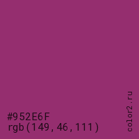Цвет #952E6F в цветовой модели RGB обозначается тремя октетами (149, 46, 111) в десятичном формате и #952E6F в шестнадцатиричном (hex) формате, которые являются интенсивностью красного 149 (hex 95), интенсивность зелёного 46 (hex 2E) и интенсивность синего 111 (hex 6F).