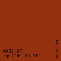 Цвет #95310F в цветовой модели RGB обозначается тремя октетами (149, 49, 15) в десятичном формате и #95310F в шестнадцатиричном (hex) формате, которые являются интенсивностью красного 149 (hex 95), интенсивность зелёного 49 (hex 31) и интенсивность синего 15 (hex 0F).