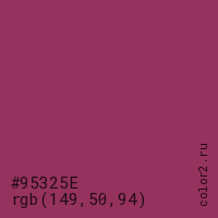 Цвет #95325E в цветовой модели RGB обозначается тремя октетами (149, 50, 94) в десятичном формате и #95325E в шестнадцатиричном (hex) формате, которые являются интенсивностью красного 149 (hex 95), интенсивность зелёного 50 (hex 32) и интенсивность синего 94 (hex 5E).