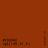 Цвет #953306 в цветовой модели RGB обозначается тремя октетами (149, 51, 6) в десятичном формате и #953306 в шестнадцатиричном (hex) формате, которые являются интенсивностью красного 149 (hex 95), интенсивность зелёного 51 (hex 33) и интенсивность синего 6 (hex 06).