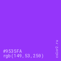 Цвет #9535FA в цветовой модели RGB обозначается тремя октетами (149, 53, 250) в десятичном формате и #9535FA в шестнадцатиричном (hex) формате, которые являются интенсивностью красного 149 (hex 95), интенсивность зелёного 53 (hex 35) и интенсивность синего 250 (hex FA).