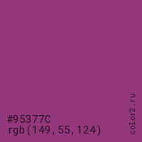 Цвет #95377C в цветовой модели RGB обозначается тремя октетами (149, 55, 124) в десятичном формате и #95377C в шестнадцатиричном (hex) формате, которые являются интенсивностью красного 149 (hex 95), интенсивность зелёного 55 (hex 37) и интенсивность синего 124 (hex 7C).