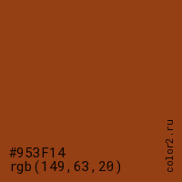 Цвет #953F14 в цветовой модели RGB обозначается тремя октетами (149, 63, 20) в десятичном формате и #953F14 в шестнадцатиричном (hex) формате, которые являются интенсивностью красного 149 (hex 95), интенсивность зелёного 63 (hex 3F) и интенсивность синего 20 (hex 14).