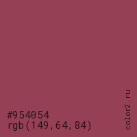 Цвет #954054 в цветовой модели RGB обозначается тремя октетами (149, 64, 84) в десятичном формате и #954054 в шестнадцатиричном (hex) формате, которые являются интенсивностью красного 149 (hex 95), интенсивность зелёного 64 (hex 40) и интенсивность синего 84 (hex 54).